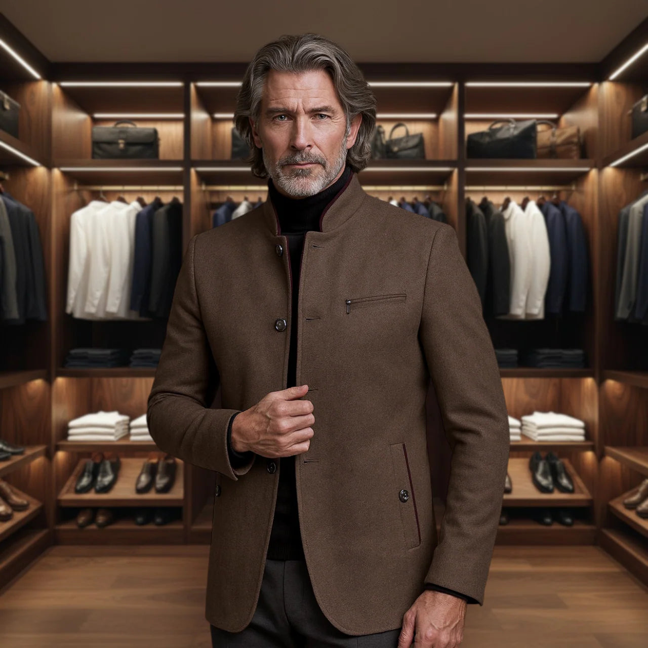 Questa giacca si ispira al fascino delle divise d’un tempo, reinterpretata per l’uomo moderno che sa imporsi senza alzare la voce. Il collo alla coreana e la linea slanciata donano una presenza regale, perfetta per chi desidera distinguersi con autorità e misura. È una giacca che parla di disciplina, di stile e di carattere.